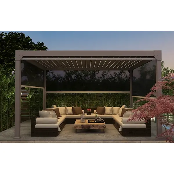電動格納式ガゼボのメインフレームは、6063-T5 航空宇宙グレードのアルミニウム合金を使用しており、プロファイルの壁の厚さは 3.0 mm 以上で、強化されたリブ設計が施されています。優れた耐風圧性と耐積雪性を備え、沿岸部や風の強い地域などの複雑な環境での使用に適しています。フッ素溶射・木目転写印刷技術による表面処理を施し、耐紫外線・耐酸性雨・耐腐食性を備えています。屋外でも錆びたり色あせたりすることがなく、理論上の耐用年数は20年以上です。ルーバーは防水構造アルミニウム合金ブレードを使用し、EPDM シール ストリップと組み合わせて、閉じたときに漏れがなく、大雨の中でも内部を乾燥した状態に保ちます。